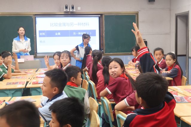 志愿者夏文丽同学从日常生活中常见的房屋类型讲起,展示钢筋混凝土房屋、木屋、石墙房屋等不同建筑,讲解木材、金属、混凝土等材料的基本特性。孩子们亲手触摸不同材料的样本,在对比中直观感知其差异,现场不时传来“原来木头这么轻!”“砖瓦摸起来好粗糙!”等充满好奇的感叹声。