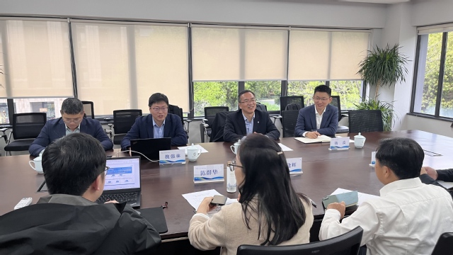 上午,刘义保一行首先来到浙江省生态环境集团。浙江省生态环境集团董事戴逢辉、集团团委书记钮云龙、浙江国辐环保科技有限公司总经理戴争博和陈群华等对学院一行的到访表示热烈欢迎,并详细介绍了集团的发展历程、业务布局及未来规划。魏强林详细介绍了学院在学科专业建设、人才培养社会服务等方面的发展情况;杨波从科技创新平台、科研项目及产学研合作成果等方面展示了学校科技实力与发展愿景。双方围绕辐射环境监测领域的人才培养、科研合作、学生实习就业等方面进行了深入交流。座谈会上,双方就共建学生实习实践基地、优化学生职业发展支持体系等达成初步合作意向。刘义保表示,希望以此次走访为契机,进一步推动产学研深度融合,在项目联合攻关、学生实习实训等方面开展常态化合作,共同助力辐射环保产业人才队伍建设。
